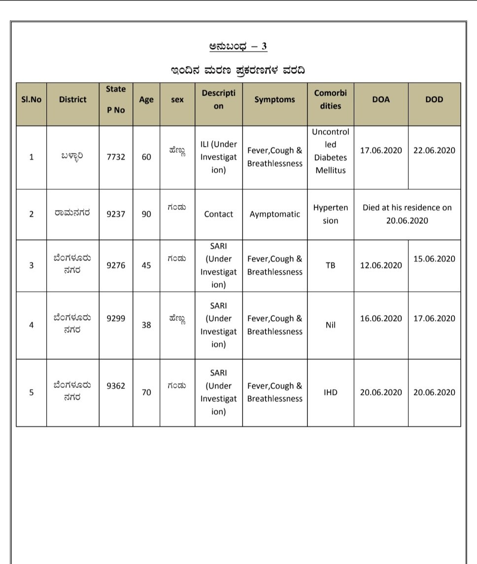 ಇನ್ನೂ ಇಂದು ಬೆಂಗಳೂರು ನಗರದಲ್ಲಿ ಪಿ.9276, ಪಿ.9299, ಪಿ.9362 ಸೋಂಕಿತರು ಸಾವನ್ನಪ್ಪಿದ್ದರೇ, ಬಳ್ಳಾರಿಯಲ್ಲಿ ಪಿ.7732 ಹಾಗೂ ರಾಮನಗರದಲ್ಲಿ ಪಿ.9237 ಸೋಂಕಿತರು ಸೇರಿ ಒಟ್ಟು ಐವರು ಕಿಲ್ಲರ್ ಕೊರೋನಾಗೆ ಬಲಿಯಾಗಿದ್ದಾರೆ. ಈ ಮೂಲಕ ರಾಜ್ಯದಲ್ಲಿ ಸಾವಿನ ಸಂಖ್ಯೆ 142ಕ್ಕೆ ಏರಿಕೆಯಾಗಿರುವುದಾಗಿ ತಿಳಿದು ಬಂದಿದೆ.