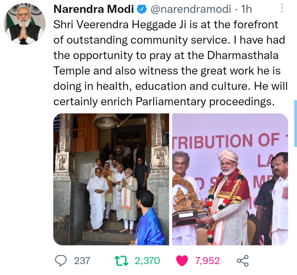 ಬೆಂಗಳೂರು: ಶ್ರೀ ಕ್ಷೇತ್ರ ಧರ್ಮಸ್ಥಳದ ಧರ್ಮಾಧಿಕಾರಿ ಡಾ.ಡಿ.ವೀರೇಂದ್ರ ಹೆಗ್ಗಡೆ ಸಹಿತ ನಾಲ್ವರನ್ನು ರಾಜ್ಯಸಭೆಗೆ ನಾಮ ನಿರ್ದೇಶನ ಮಾಡಲಾಗಿದೆ.